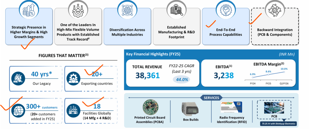 Manufactures various electronic sub-assemblies, assemblies and box builds, disk drives, memory modules, power supplies/adapters, fiber optic assemblies, magnetic induction coils and RFID products, and other electronic products. The company is a part of Tandon Group with Sandeep Tandon as chairman of the company. Its manufacturing facilities are spread across Northern India (Bawal, Haryana, Manesar, Haryana, Baddi, Himachal Pradesh) and southern India – Chennai (Tamil Nadu), Bengaluru (Karnataka).